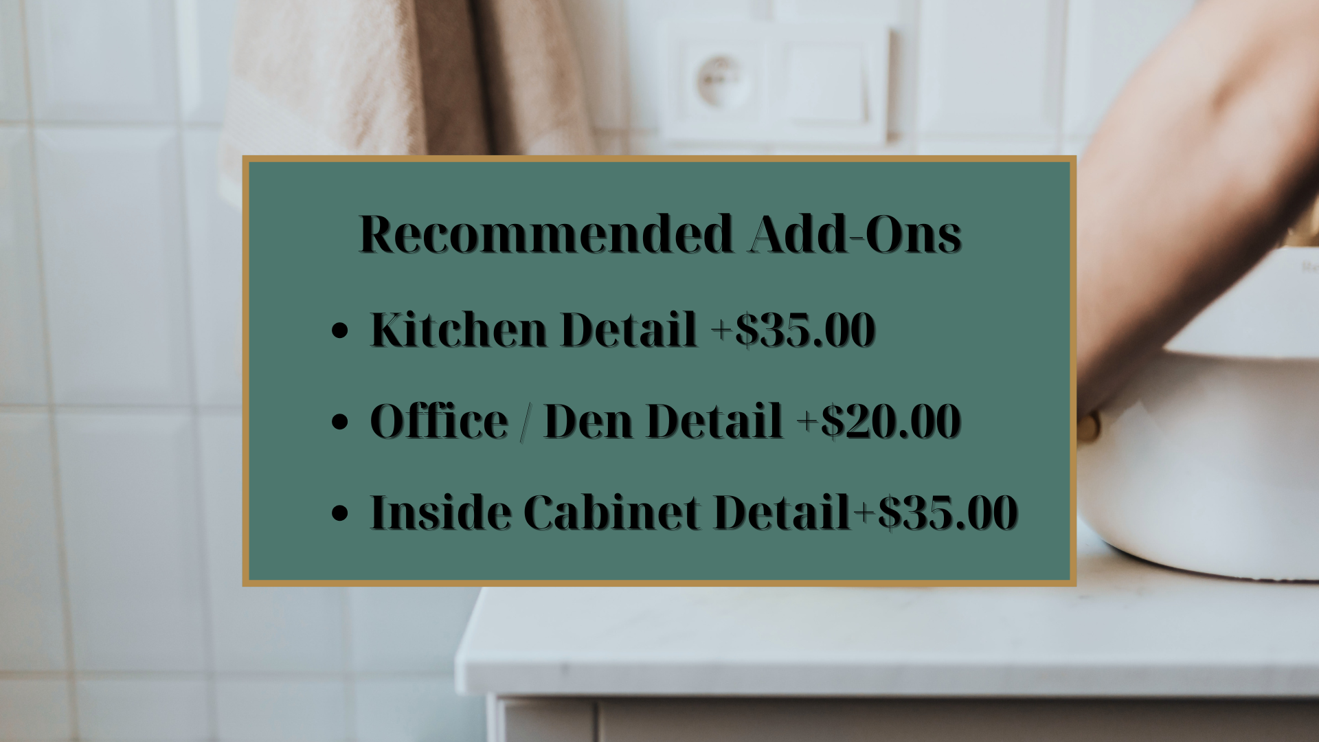 This service is exclusively focused on one full bathroom (tub/shower included). If you have multiple bathrooms or want to extend this level of detailing to the rest of your home, consider pairing it with these add-ons:
