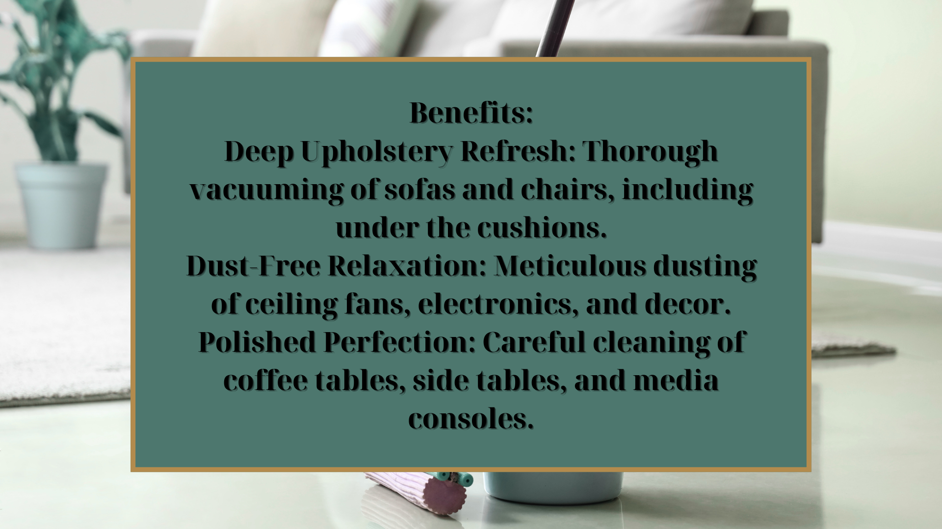 Our technicians spend dedicated time focusing purely on the surfaces, furniture, and hidden dust traps in your living area:
