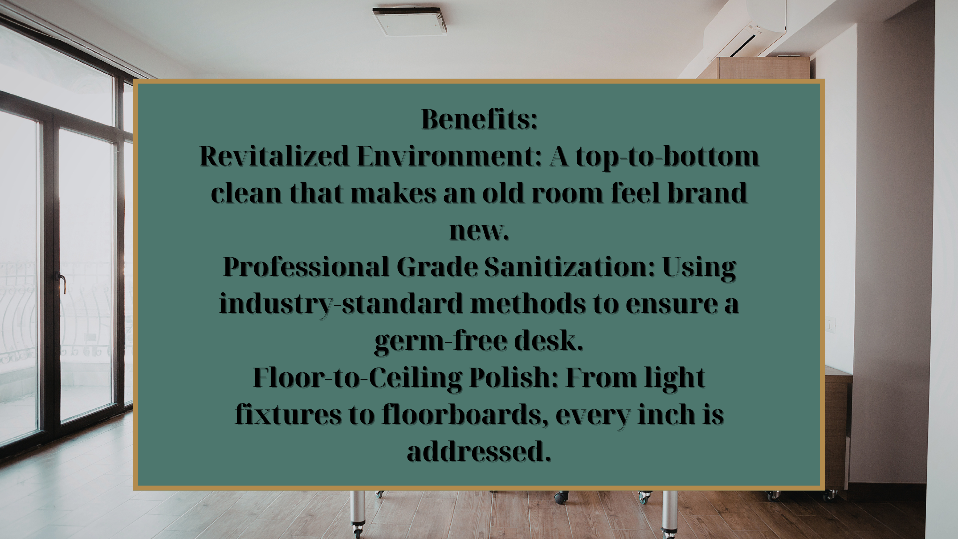 • Intensive detail: Hand-wiping of all office baseboards