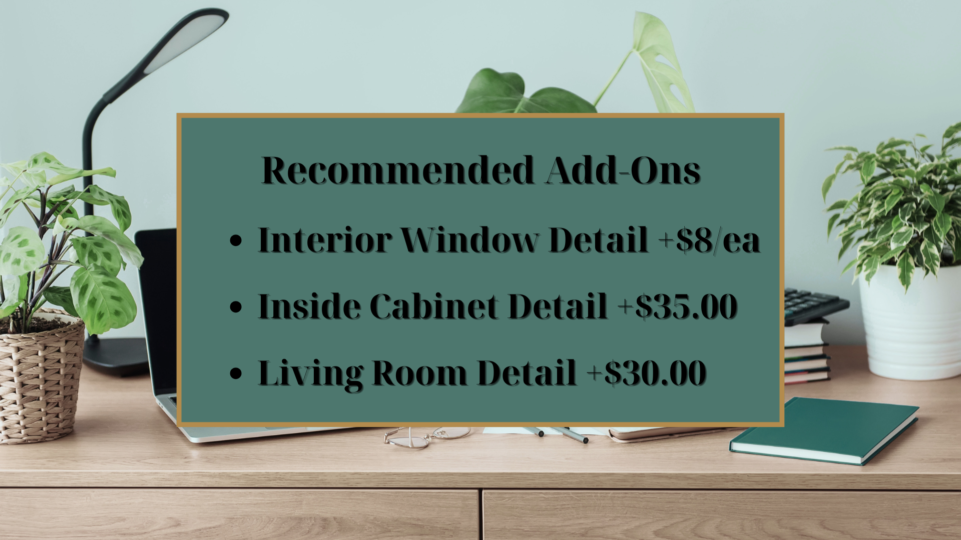 This service is exclusively focused on your main office or den. If you'd like to extend this level of detailing to connected areas, consider pairing it with these add-ons: